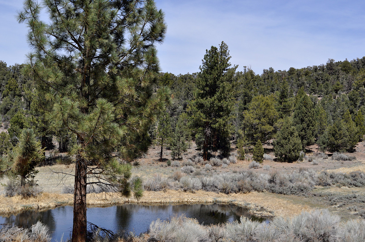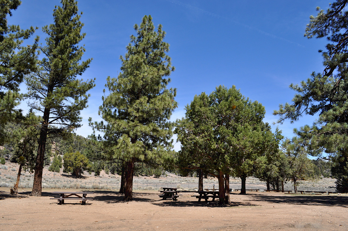 The campground is located in the San Bernardino Mountains at an elevation of 7,739 feet, where ponderosa pines dot the site. A pinyon pine and juniper woodland and meadow surround the area and a small pond is on-site.