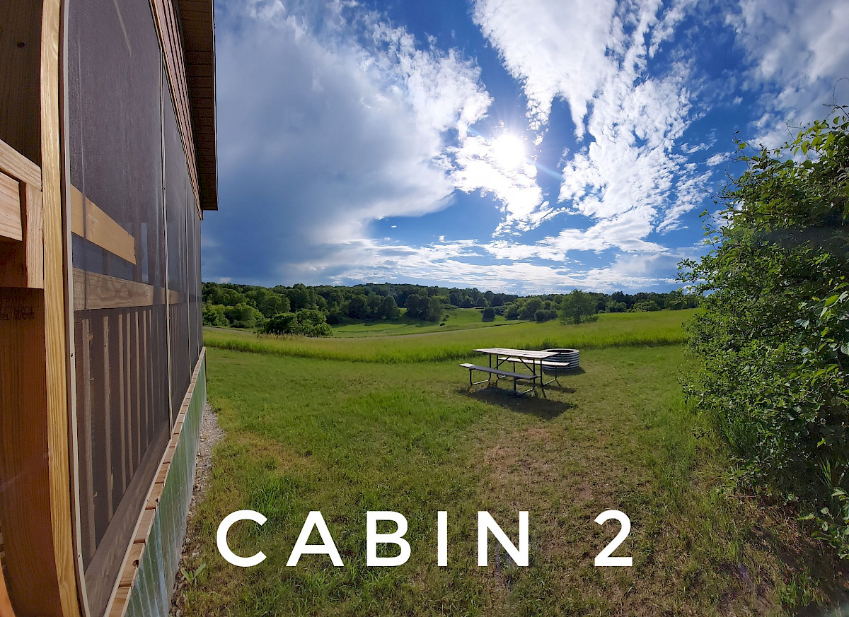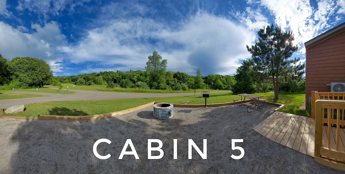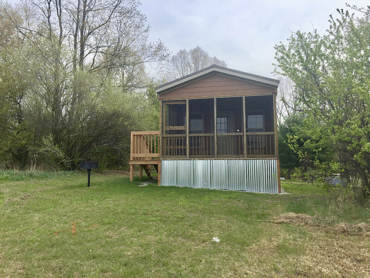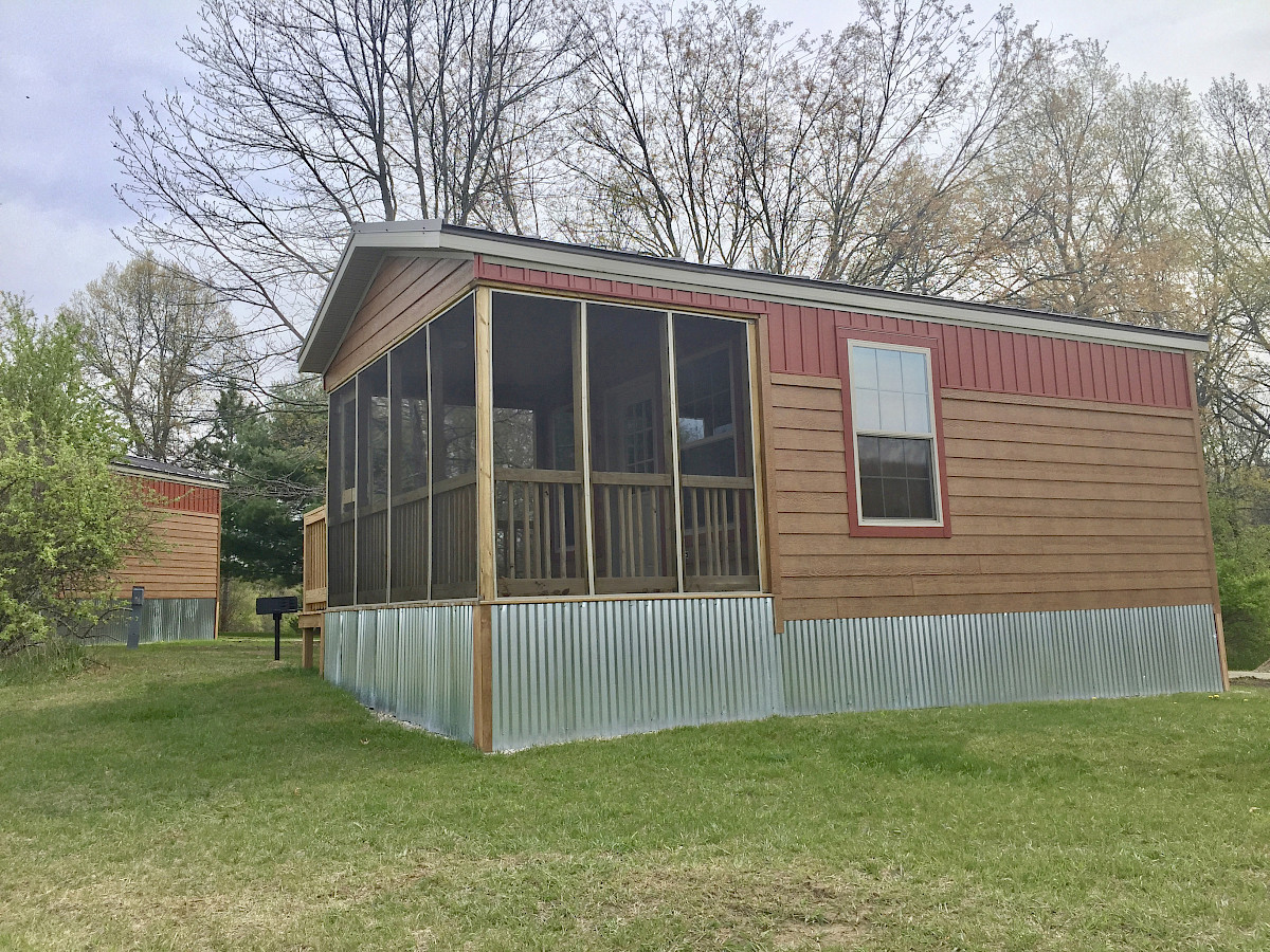 Prime campsites at Pontiac Lake Recreation Area Campground now have lodge style, camper cabins! Amenities include one set of bunk beds and one queen bed in the back bedroom, and a futon in the living room. These units sleep up to 6 persons. In the common area, you will find a dining space and mini kitchenette supplied with a mini fridge, microwave, and coffee maker. Please bring your own cooking essentials. Each cabin site has a picnic table and fire grill/pit combo to give you that outdoor camping experience! These rentals are electric-only, providing heating and cooling, but no running water. The campground's restroom facilities are a short distance away. All cabins have a screened-in front porch and patio furniture allowing visitors to enjoy the hill-top views in the campground.
