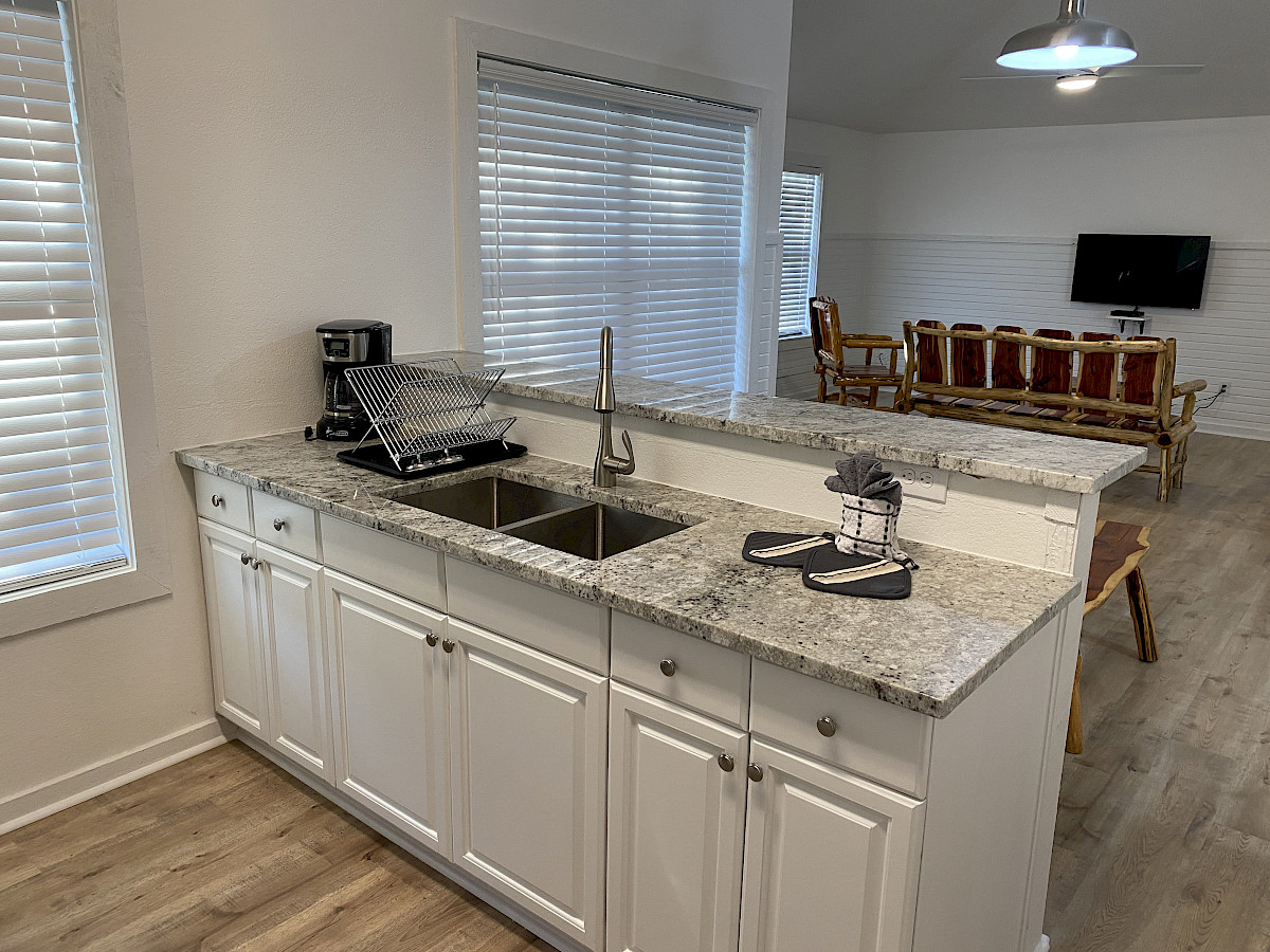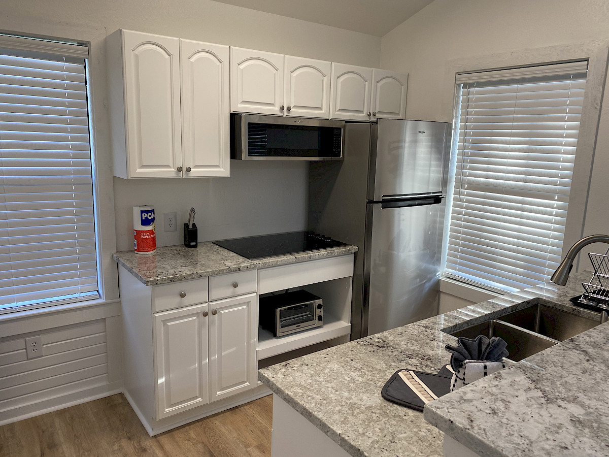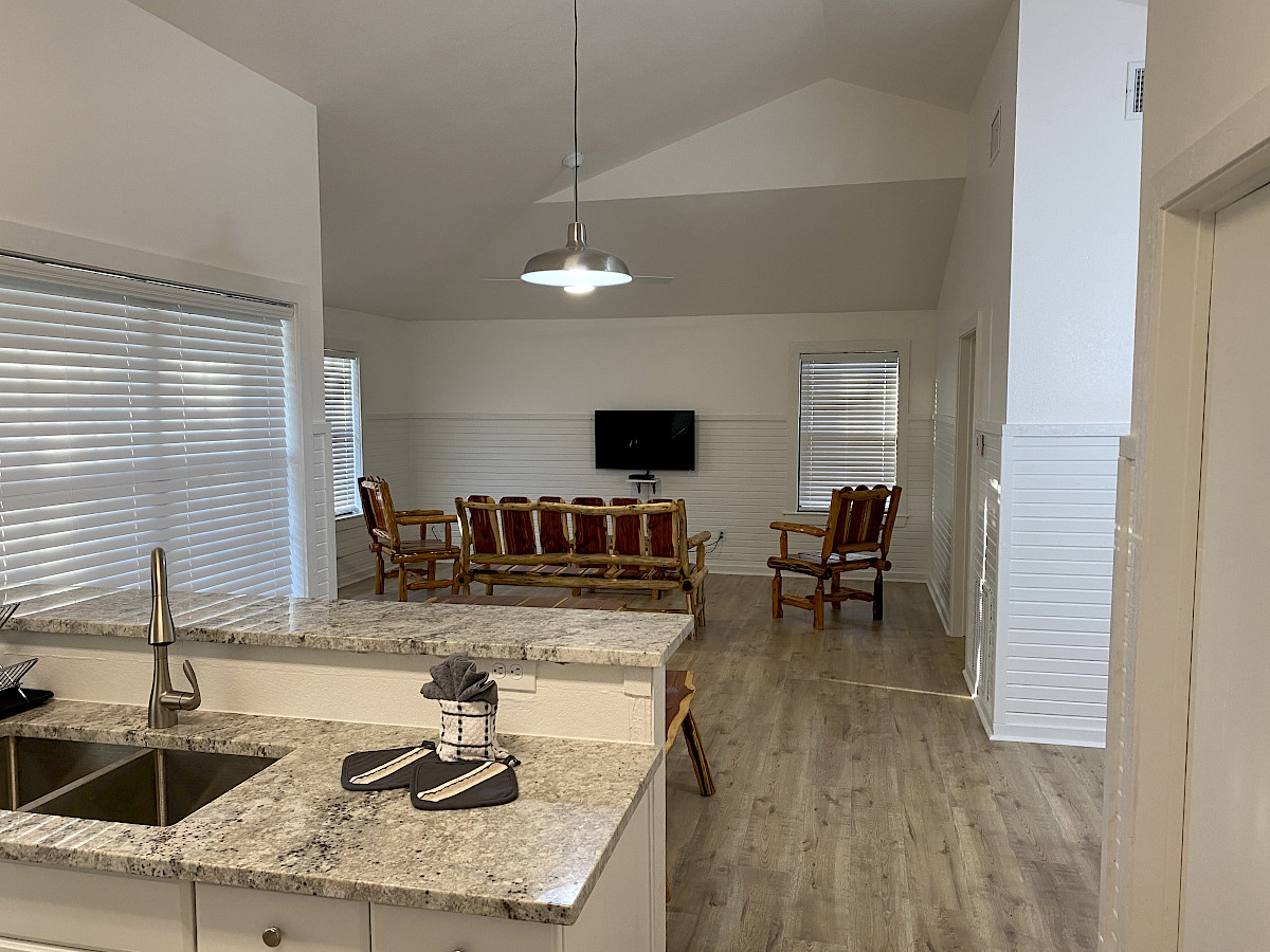 - 2 two-bedroom cabins (109 & 110) that sleep 4. These have a full kitchen with cooktop, full size refrigerator, microwave, coffee pot, and large bath.