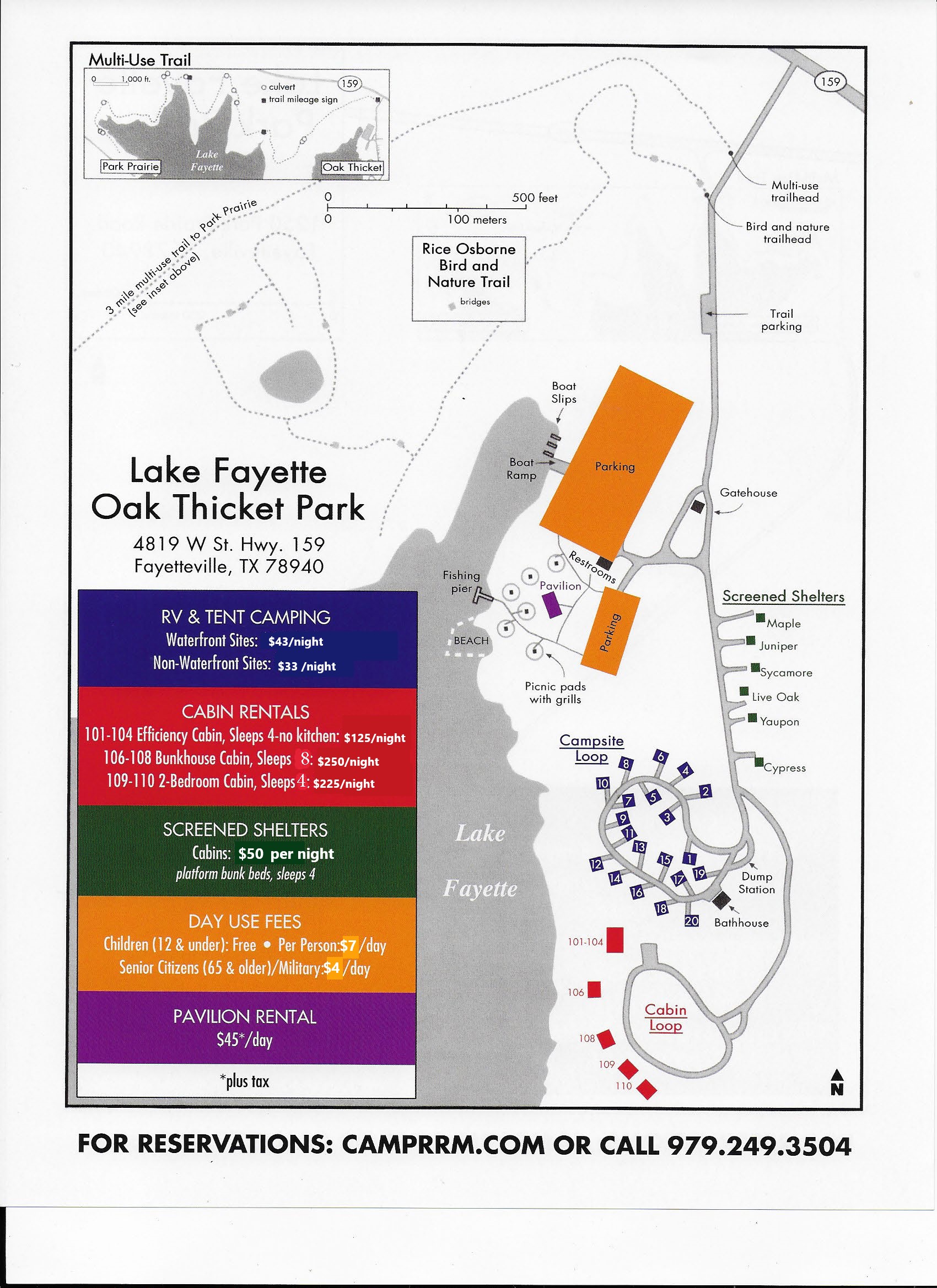 Reserve Campground NowDescription Fee Info RV Campsite (w/ electric and water) $33 Nightly rate Waterfront RV Campsite (w/ electric and water) $43 Nightly rate Screened Shelter $50 Nightly rate